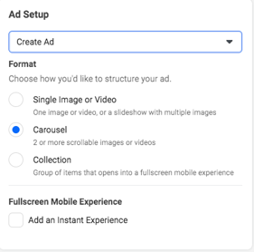 When choosing the type of ad you’d like to run, the two most popular options are single image ads and carousels. Links display one image, while carousels display three to five scrolling images. Generally, carousel ads are most effective when you want to highlight multiple products, services, or benefits in a single ad.